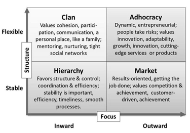 By analysing how internally and externally focused you are and how flexible and stable your structure is, we’ll find out which of four cultures your organisation favours and where it wants to be.